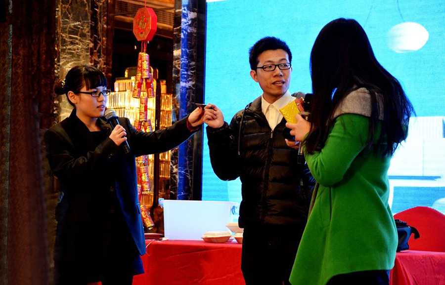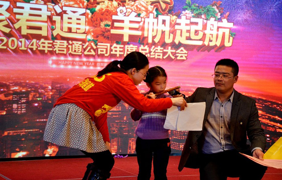 | 2015年2月11日,民间俗称的小年,好日子。 立春后的江南阳光灿烂,温暖如春。 太湖畔的同庆楼百合厅流光溢彩,喜气洋洋。身着节日盛装的青春少女鱼贯而入,留下银玲般的笑声,走过她们身边,仿佛被青春撞了一下腰。 君通春晚在欢快的乐曲声中,在员工的欢呼声中拉开了帷幕。 君通总经理尹可珍女士发表了热情洋溢的新年贺词。2000年10月尹可珍女士创立君通公司,几度风雨几度春秋,君通经过十四年发展成为本地IT行业中实力强的企业。熟识我的博友可能都知道,可珍晚常提到的君子兰,我好的女朋友。很开心参加这个欢乐的盛会,虽没有明星大腕,没有星光灿烂,却是每个君通人的倾情演绎,真情流露,好。 ![]() 君通的春晚现场仿佛是一个欢乐的大家庭,演出以部门家庭为单位,更有许多员工可爱的孩子也表演了许多节目。 市场部的美女妈妈带着双胞胎女儿跳起了欢快的《小苹果》