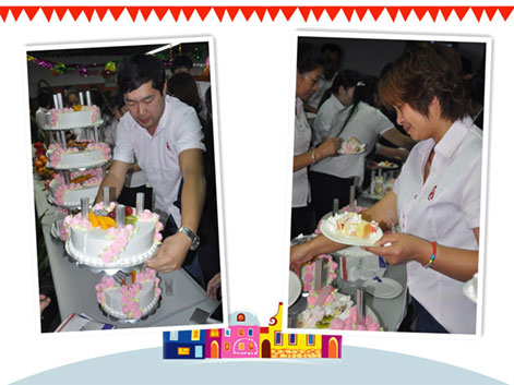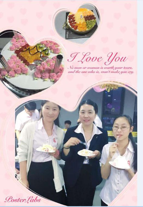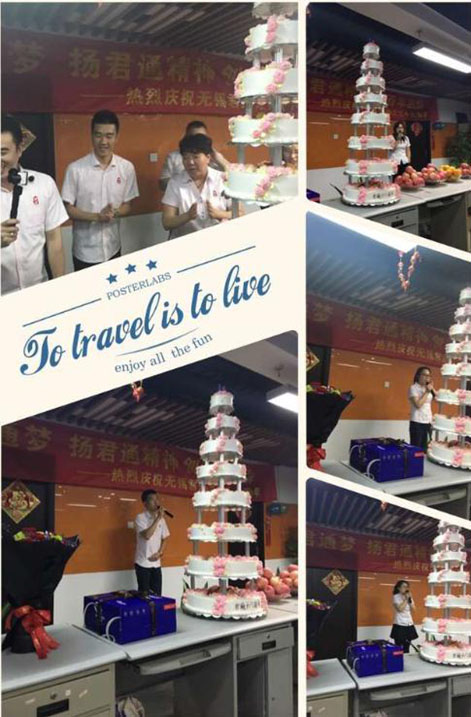 说出对尹总、对公司的各种感激的情愫和送出对公司的祝福后,伙伴们期待的大蛋糕的心都快融化了,不过别急,在品尝我们17岁的大蛋糕前,尹总突然邀请软件部的茹宁上台,原来也是软件部茹宁的生日,贴心的尹总特意为她献上了鲜花和蛋糕: