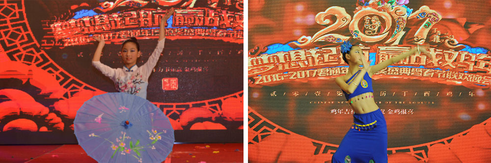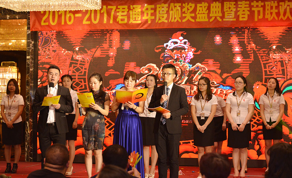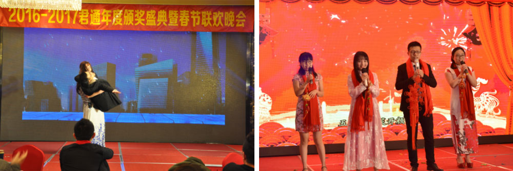 13:30分在四个主持人的主持下大家期待已久的君通的春晚拉开了帷幕,漂亮帅气的主持人给在场的所有人眼前一亮,个节目是我们市场的漂亮阿姨们带来的舞蹈《今夜舞起来》他们不仅平时销售业绩做的好,舞蹈跳的也特别好,顿时把现场的气氛带动起来了,听着旋律看着他们的扭动,台下的人都不禁的开始了扭动(像我儿子,看见阿姨们在台上面跳舞非要上去,在下面扭动自己的胳膊小屁股),接下来的歌曲舞蹈及小品,让台下不禁的尖叫声和欢呼声,技术部的小品《我要跳楼》彭郁那颠覆性的打扮,博得台下人的捧腹大笑,还有优化和客服带来的舞蹈《哈哈颂》青春活力四射,还有我们君通的下一代带来的歌曲和舞蹈以及乐器真的都很棒,还有市场部带来的小品《君通奇遇记》相信我们王经理的美人鱼的形象让大家亮瞎了眼吧?还有我们参加过江苏省比赛并获得金奖的小姑娘带来的舞蹈《月影竹林》和《太湖美》赢得台下不断的掌声,那身段那舞姿,真的是太美了,特别让我羡慕不已,哈哈哈,精彩的是下面尹总带领君通的美女们带来的古典传统的旗袍秀,各色各样的旗袍以及婀娜的步姿,赢得在场不少掌声,这是中华的美德中华的传统,在我们君通也上演了一场旗袍秀,后在行政部带来的手语舞《我相信》结束我们君通的春晚,我们相信我们的君通在2017年会更辉煌,在未来的道路上会越走越远,越来越好,因为我们是君通人,我们是真正的一家人,只要家人们团结一心,全力以赴,我相信我们会更好!