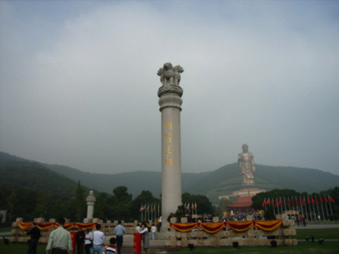 似近又远的望去,蓝天碧水间,高大的灵山大佛双目垂视,眼神睿智慈祥,在一片浓郁的青山环绕之中,好像一幅淡然的水墨画,渲染着宁静的意境,又仿佛浓墨的重彩画,渗透着高贵的气息。刚一下车,顿觉阵阵寒意袭来,车内的温暖跟外面阴沉沉的天气形成了强烈的对比,每个人都裹紧了衣服。进园前集合时尹总的一番话又调动了大家的热情,看着旁边还有一波又一波远道而来的旅游团,甚至还有手抱婴儿或者推着婴儿手推车的旅客们,似乎感觉又没那么冷了。进园之后大家自由活动了,呵呵,下面跟随我们的脚步来简单领略一下不一样的灵山胜景吧。