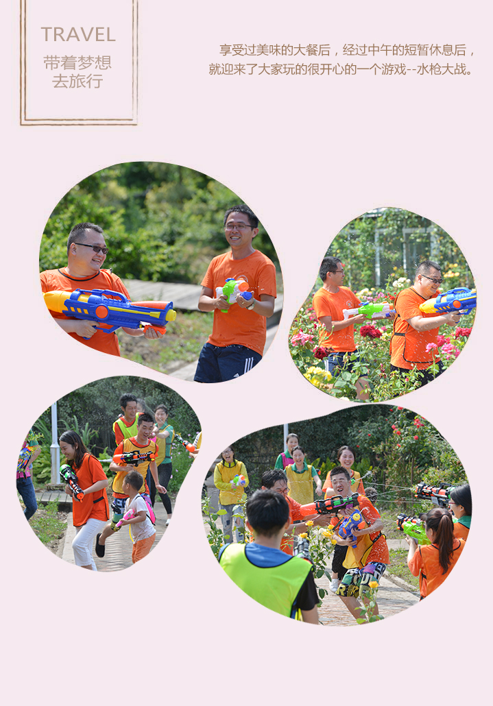 享受过美味的大餐后,经过中午的短暂休息后,迎来了大家玩的很开心的一个游戏--水枪大战。不管男生女生还是小朋友,都玩的不亦乐乎!虽然身上都已经湿透了,依然没有降低大家的热情,这样进入了一场混战。