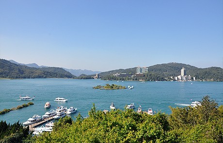 (日月潭位于台湾省一个内陆的县城——南投县,日月潭旧称水沙连,又名水社里,是台湾省大的天然淡水湖泊,堪称明珠之冠。日月潭由玉山和阿里山之间的断裂盆地积水而成,水域面积900多公顷,比杭州西湖还要大三分之一,环湖修有观光步道,可供游览参观。日月潭所以得名,是以潭中的光华岛为基点,岛北叫做前潭,形状浑圆,称为日潭;岛南叫做后潭,形状像一张弓弦,弯弯的,所以称为月潭,合起来叫做日月潭。以“旧月”映“光华”,使得整个日月潭洋溢着蓬勃的朝气。)